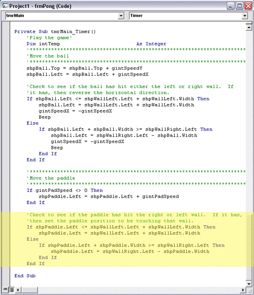 Basically, what we do here is to first compare the left hand side of the paddle to the right most part of the left side wall. If the left most part of the paddle is to the left of the right most part of the wall (shpPaddle.Left <= shpWallLeft.Left + shpWallLeft.Width), then we set it to be equal to that position. Similarly, if the right most part of the paddle is to the right of the left most part of the right wall, we set the paddle position to be just touching the right wall.